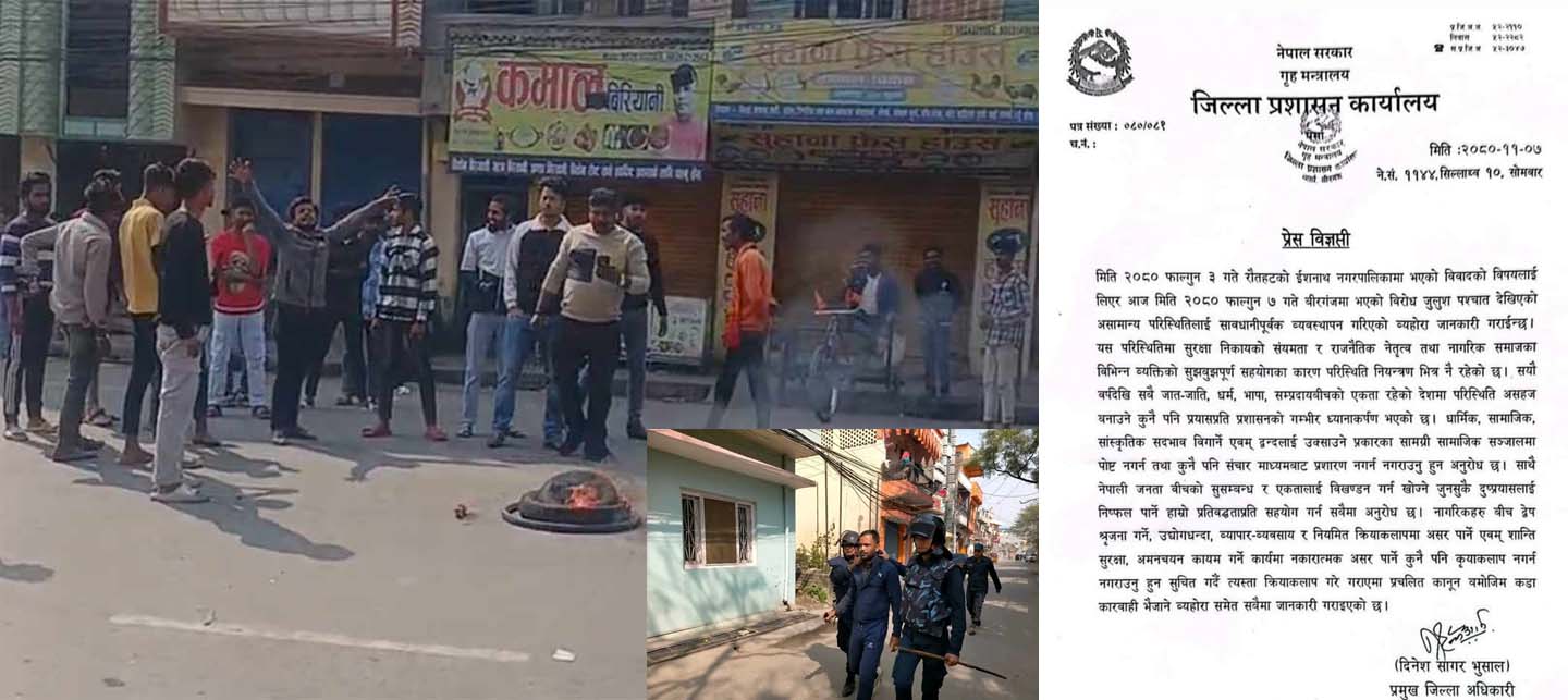 प्रमुख जिल्ला अधिकारी भुसालले एक विज्ञप्ति जारी गर्दै वीरगन्जमा देखिएको असमान्य परिस्थितिलाई सावधानीपूर्वक व्यावस्थापन गरिएको र यस परिस्थितिमा सुरक्षा निकायको संयमता र राजनैतिक नेतृत्व तथा नागरिक समाजका विभिन्न व्यक्तिहरुको सुझबुझपूर्ण सहयोगका कारण परिस्थिति नियन्त्रण भित्रै रहेको भन्न्दै सामाजिक सद्भाव बिगार्ने खालका सामग्री पोष्ट नगर्न आग्रह गरेका हुन् ।
