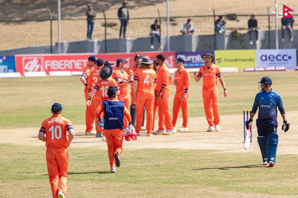 त्यसअघि कीर्तिपुरस्थित त्रिवि क्रिकेट मैदानमा टस जितेर पहिला ब्याटिङ रोजेको नेदरल्यान्ड्सले निर्धारित २० ओभरमा पाँच विकेट गुमाउँदै दुई सय ४७ रनको योगफल बनाएको थियो । नेदरल्यान्ड्सका लागि माइकल लेभिटले ६२ बलमा ११ चौका र १० छक्काको मद्दतले सर्वाधिक एक सय ३५ रनको योगदान दिएका थिए । त्यसैगरी साइब्रान्ड एङ्गेलब्रेख्तले ४० बलमा सात चौका र पाँच छक्काको मद्दतले ७५ रन जोडे । तेजा निदामनुरुले १८ रन बनाए ।